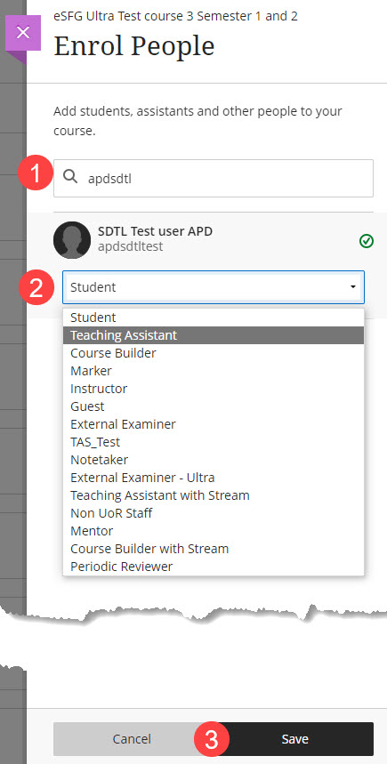 - Click on the + sign and select the desired role from the dropdown list. We recommend that you enrol yourself as Teaching Assistant – that way you will not appear in the Course Staff list that is visible to students.
