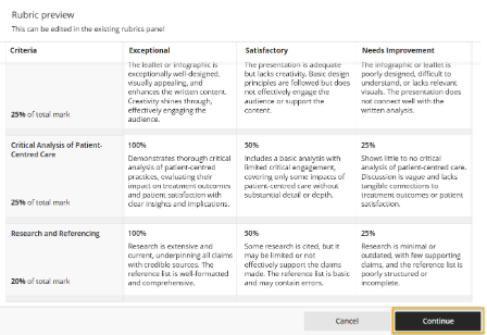 When you have a rubric that suits your purposes, you can click Continue at the bottom right-hand corner of the screen.