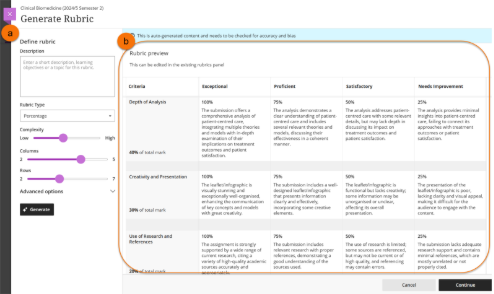 When the Generate Rubrics, screen opens, a rubric that will automatically generate in the Rubric preview area (b).