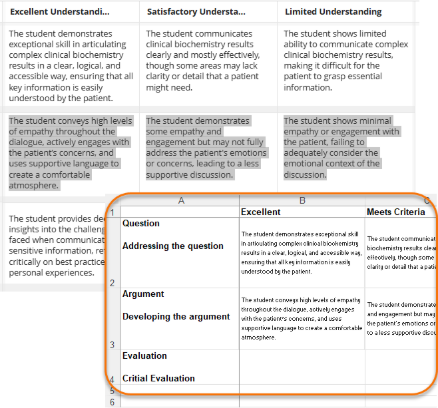 It is possible to copy and paste the rubric content to another document; this works best if you copy the cells in a row at a time.