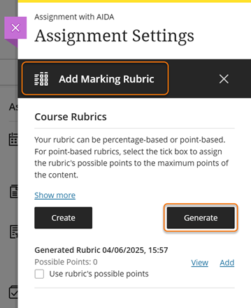 The automatically generated rubric will be based on the course title if working in the rubrics area. If starting the process from the Assignment settings panel, the text in the Instructions text box will be used to generate the rubric.