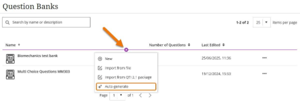 From the Question Banks page, click the purple + icon. Select “Auto-generate” from the list.