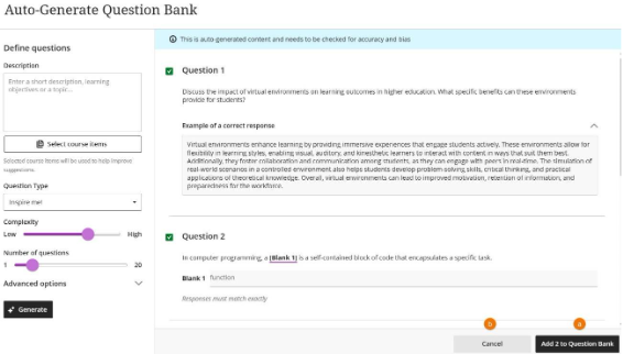 Question Banks allow instructors to create, organise, and store a database of questions that can be reused in multiple assessments or exported and shared with others. The AI Design Assistant can be used to generate Question Banks, saving time for instructors.