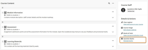 From the Content area of your course, your Question Bank can be accessed again by navigating to the “Manage banks” link in the Details & Actions menu.