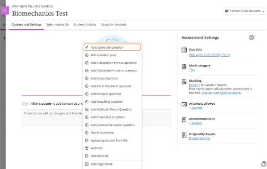 Edit settings on the setting panel on the generation screen so that the AI Design Assistant can generate more relevant and focused questions. (For more detail, please see our guide – Blackboard AI Design Assistant – General settings.)