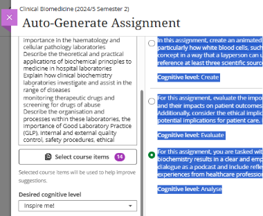 - This tool is best used for generating assessment ideas based on course content, we recommend exploring the outputs when using your practice course, to generate some ideas before finalising your assignment brief.