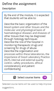 The description field can be used to add text prompts (See how to write effective prompts for Blackboard AI Design Assistant – AI Prompt writing) this would be a good place to add the learning outcome for the module and those for this specific assignment. A large amount of text can be cut and pasted into this field, there is a 2000 character limit (approximately 333 – 400 words).