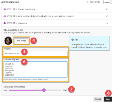 Blackboard’s AI Conversations tool helps you create guided discussions where students can talk to a character or explore a topic by asking questions. AI Conversations has two components:
