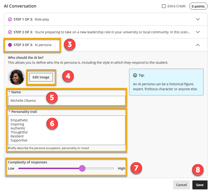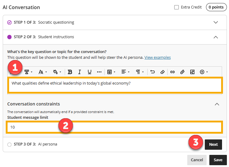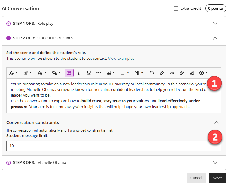 - Clicking the Conversation constraints drop-down, you can set a maximum number of exchanges between the student and the AI persona. This helps give the activity a clear structure and prevents conversations continuing indefinitely. Students are notified of how many responses they have remaining.