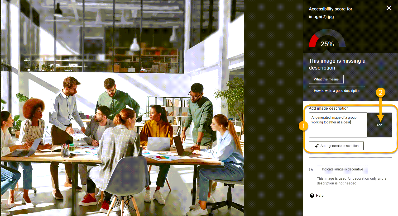 Select the Ally alt text editor, and add appropriate or improve the Alt text, Auto-generate, or indicate the image is decorative only, then click ‘Add‘.