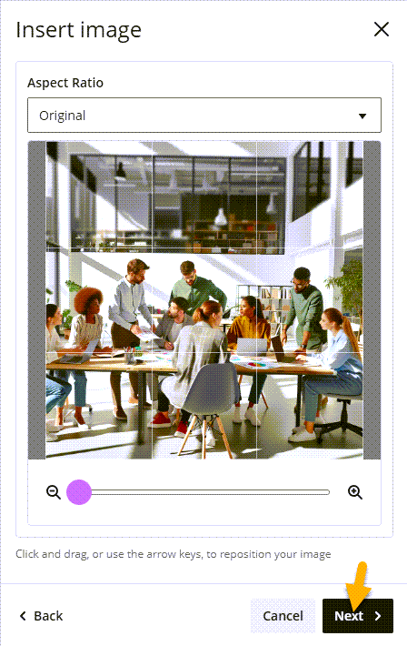 Once you have selected your image you can then crop and orient your image to your requirements, once you are happy, click ‘Next’: