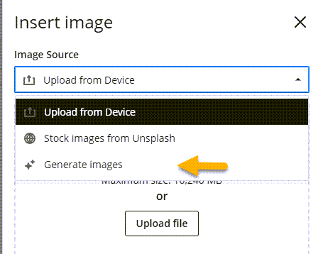 Select the ‘Generate images’ option from the dropdown, enter your descriptive prompt in the text box, and click ‘Generate image.’ You can repeat this until you reach desired result: