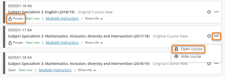 Any courses shown here as ‘Private’ are unavailable to students. You can quickly make them available from this page.