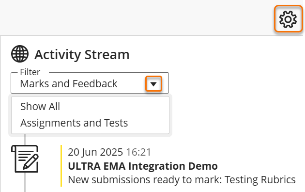 In the activity stream you can use the filter to focus on Marks and Feedback or Assignments and Tests.