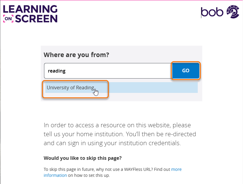 When a user clicks on the link, they will be taken to the main Box of Broadcasts login page, and will have to select ‘University of Reading’ before they can log on and view the recording.