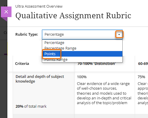 Currently in Blackboard Ultra all Rubric are scoring. If you copy a qualitative rubric from a pre 2024/5 course, it will be converted into a scoring rubric in Ultra, but with 0 points associated with each criterion.