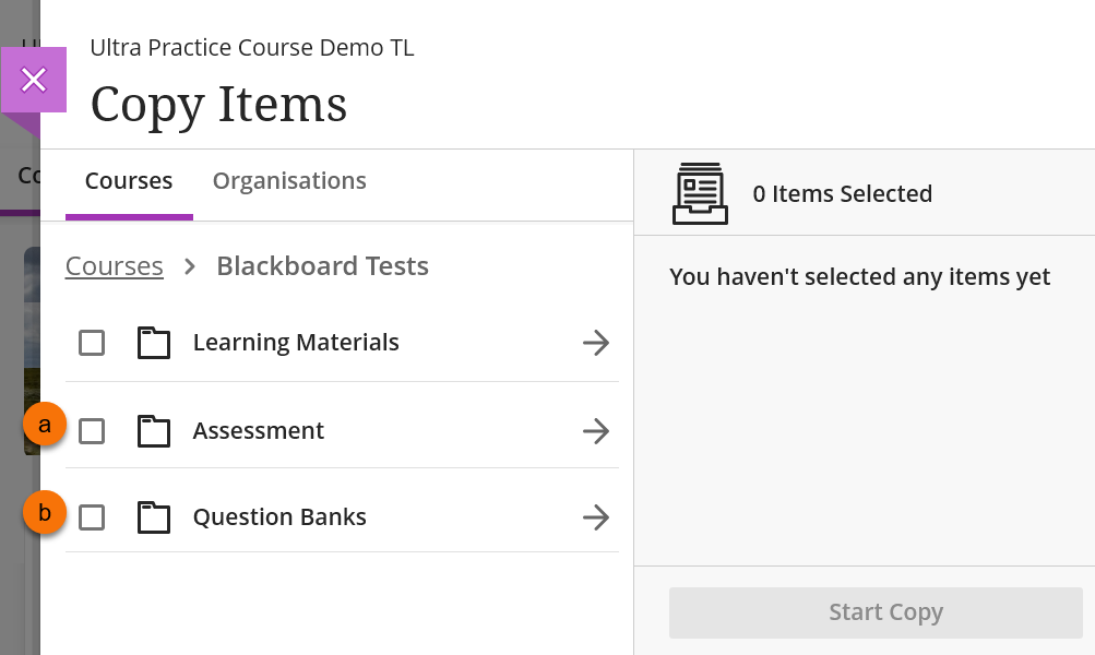 - Step 2: In the copy items screen locate the relevant course/organisation