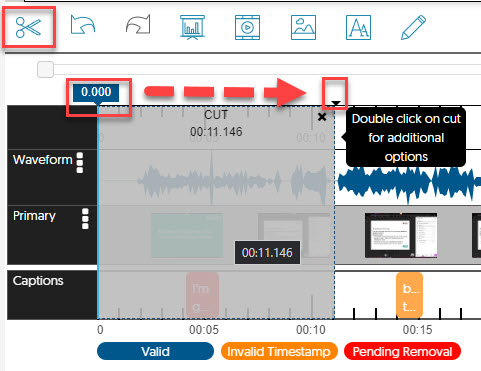 - Cutting means selecting a timestamp anywhere on the video timeline and dragging out to mark a section for removal. Double clicking on a cut/trim will allow you to enter specific timestamps if you find dragging is not accurate enough.