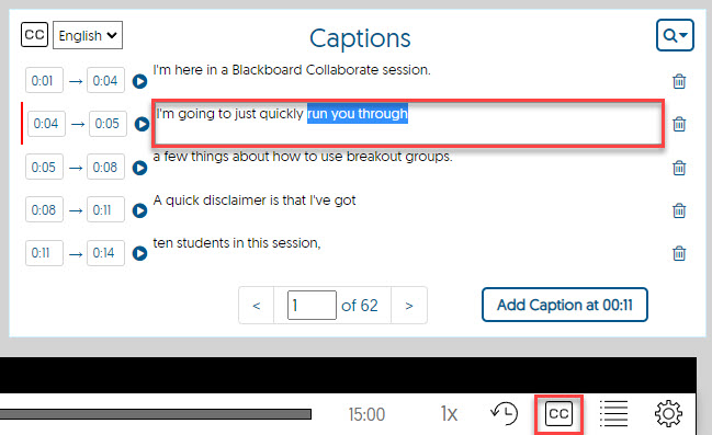 Captions appear as a Stream at the bottom of the YuJa editor timeline and will be indicated by blocks of text on the timeline. To edit the captions however, you will need to click on the closed captions icon on the toolbar underneath the video preview (right side).