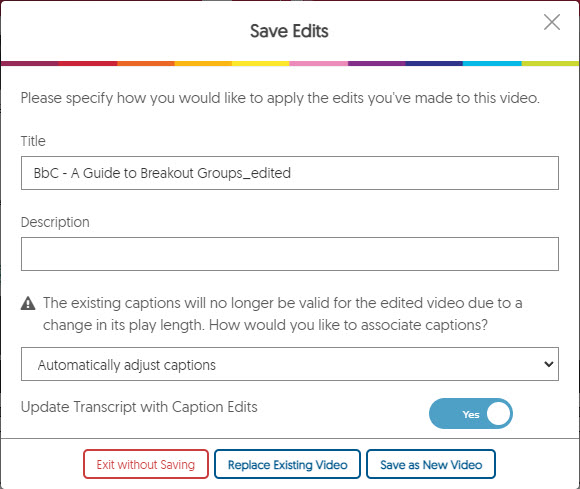 For the majority of edits performed in YuJa, most will not process until the video has been saved, after which you will need to allow time for the video to process again before you can review the changes you’ve made. YuJa will also ask you if you want to have the captions automatically adjusted to reflect your changes which is recommended.