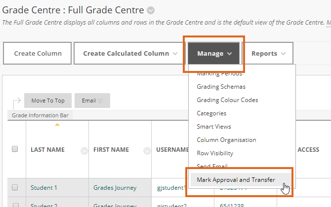 Home / Original Category Archive / Grade Approval and Transfer – approving marks for transfer to RISIS / Grade Centre – Manage – Mark Approval Grade Centre – Manage – Mark Approval Leave a Comment / By andyturner / December 12, 2018 Screenshot showing the Grade Centre, with the location of ‘Mark Approval and Transfer’ on the Manage menu.