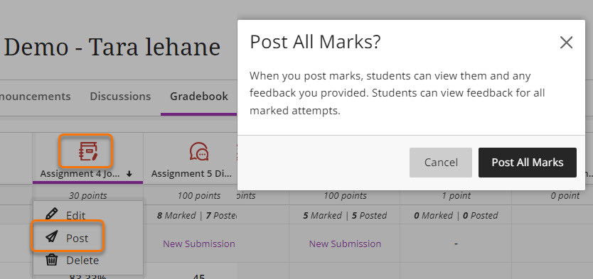 To allow students to view their marks and feedback for Blackboard internal assessment tools such as, Assignments, Discussions, Journals and manually marked Tests, Programme Administrators need to Post Marks in the Gradebook, marking screen or the assessment submission tab.