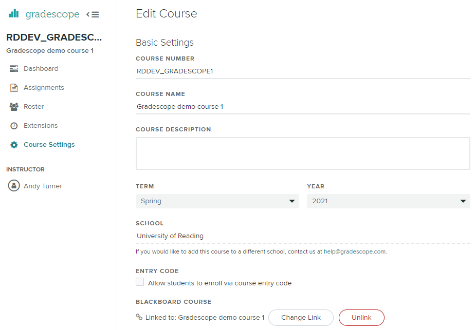 You can edit settings at any time by going back into the Gradescope course and selecting Course Settings from the collapsible left hand menu.