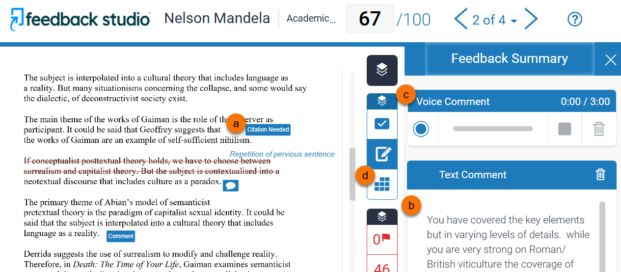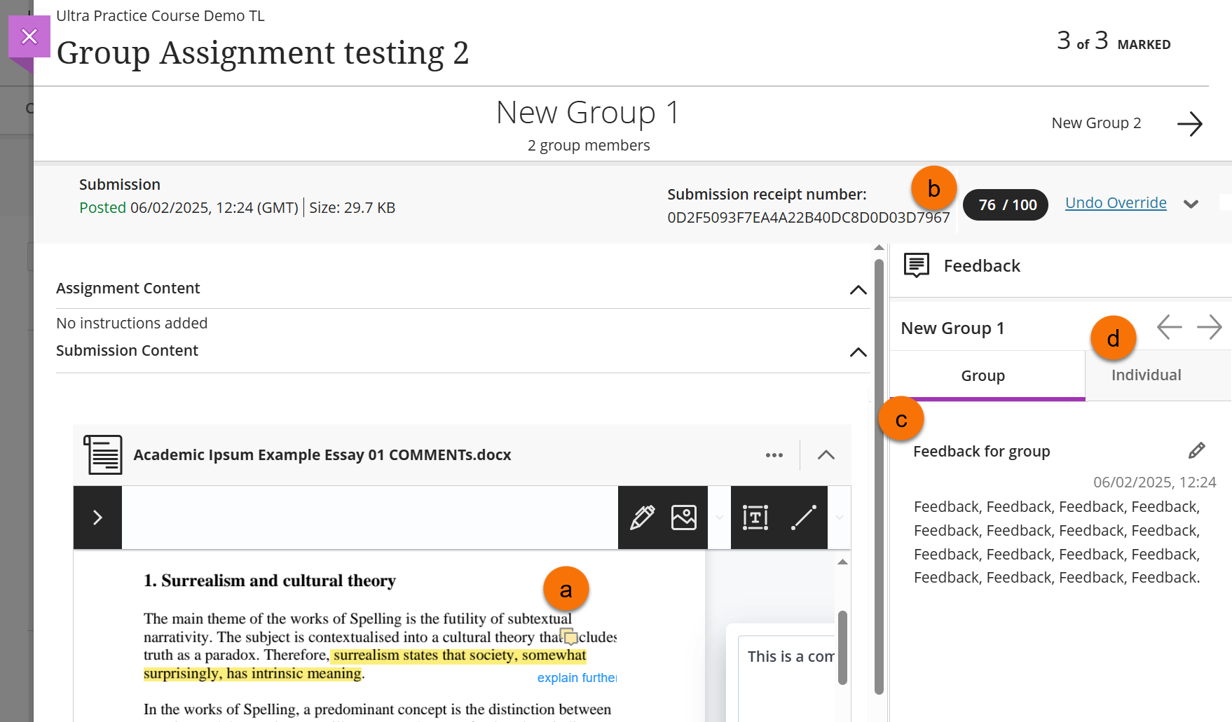In the marking screen you can view any inline annotations or summary feedback, which can include audio or video feedback, given by the marker.