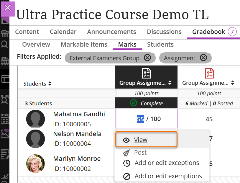If you wish to see the marks and feedback for all the students, not just those in the moderation sample you could remove the filters pertaining to the students, in the example above this would mean removing Group 1 and Group 2 from the list of filters.