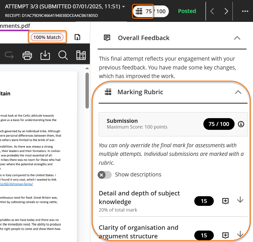The paper will open in the Feedback Studio where you can see annotations, summary comments and rubrics, depending on how the marker has used these tools.