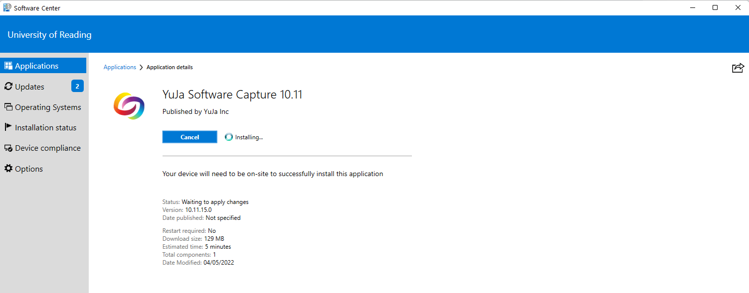 1 – via Windows Software Center: The Software Center is available to older University staff devices. You can install the YuJa Software Capture app on a Windows PC via “Software Center“.