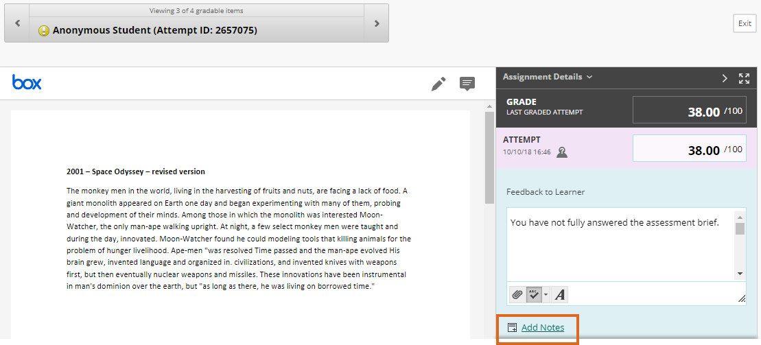 Home / Assessment & Feedback / Internal moderation workflow 3: Blackboard Anonymous Marking + Anonymous Moderation inside 15 days / Blackboard Anonymous Marking – Add Grading Notes Blackboard Anonymous Marking – Add Grading Notes Leave a Comment / By andyturner / October 19, 2018 Screenshot showing where to add private Grading Notes.
