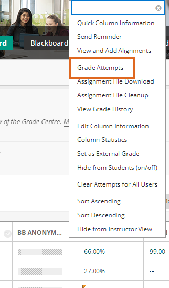 Home / Assessment & Feedback / Internal moderation workflow 3: Blackboard Anonymous Marking + Anonymous Moderation inside 15 days / Blackboard Anonymous Marking – Grade Attempts Blackboard Anonymous Marking – Grade Attempts Leave a Comment / By andyturner / October 19, 2018 Screenshot showing how to access ‘Grade Attempts’ from a Grade Centre column.