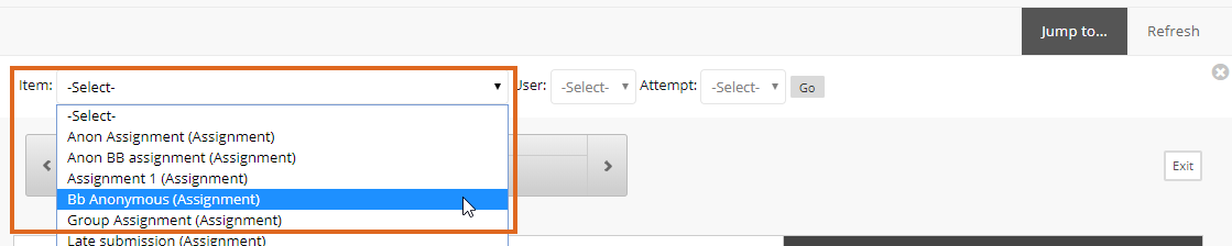 Home / Assessment & Feedback / Internal moderation workflow 3: Blackboard Anonymous Marking + Anonymous Moderation inside 15 days / Blackboard Anonymous Marking – Jump to Attempt – select Assignment Blackboard Anonymous Marking – Jump to Attempt – select Assignment Leave a Comment / By andyturner / October 19, 2018