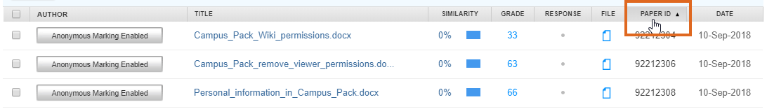 Home / Assessment & Feedback / Internal moderation workflow 7: Turnitin Anonymous Marking + Anonymous Moderation inside 15 days / Turnitin Anonymous Marking – sort by Paper ID Turnitin Anonymous Marking – sort by Paper ID Leave a Comment / By andyturner / October 19, 2018 Screenshot showing how to sort the Turnitin Inbox by Paper ID