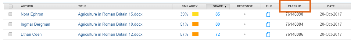 Home / Assessment & Feedback / Internal moderation workflow 7: Turnitin Anonymous Marking + Anonymous Moderation inside 15 days / Turnitin Named Marking – sort by Paper ID Turnitin Named Marking – sort by Paper ID Leave a Comment / By andyturner / October 19, 2018 Screenshot showing how to sort the Turnitin Assignment Inbox by Paper ID