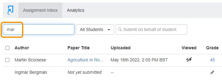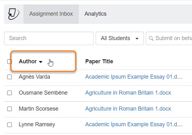If useful, you can also sort the Turnitin Assignment Inbox by Author.