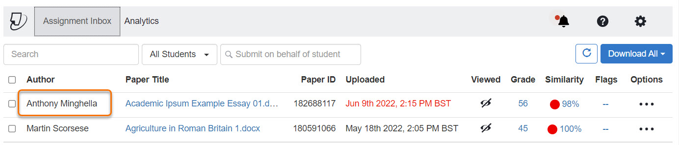 - Open the Turnitin Assignment Inbox. Use student names to flag papers which you wish to be moderated.