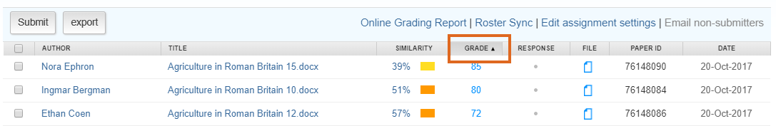 Home / Assessment & Feedback / Internal moderation workflow 6: Turnitin Named Marking + Named Moderation after 15 days / Turnitin Named Marking – sort by Grade Turnitin Named Marking – sort by Grade Leave a Comment / By andyturner / October 19, 2018 Screenshot showing how to sort the Turnitin Inbox by Grade