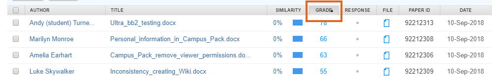 Home / Assessment & Feedback / Internal moderation workflow 6: Turnitin Named Marking + Named Moderation after 15 days / Turnitin Named Marking – sort by Grade Turnitin Named Marking – sort by Grade Leave a Comment / By andyturner / October 19, 2018 Screenshot showing how to sort the Turnitin Assignment Inbox by Grade