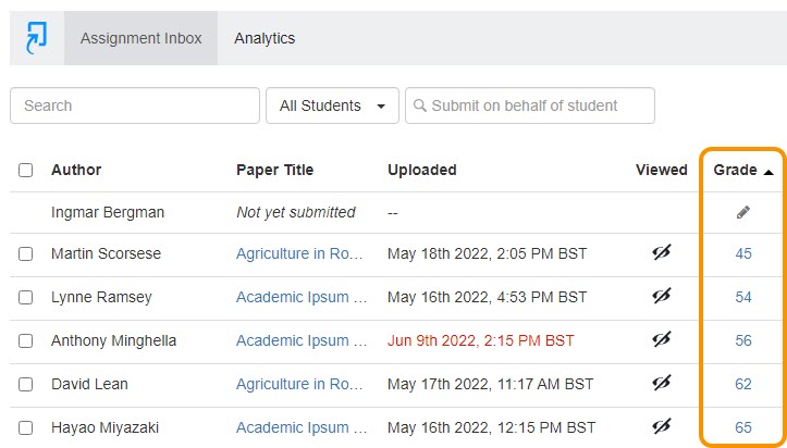 - Open the Turnitin Assignment Inbox. Use the student names to flag papers which you wish to be moderated.