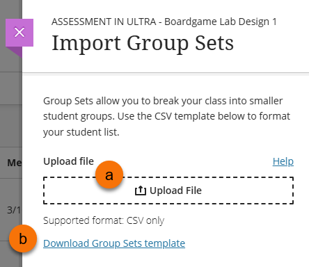 - If you do not have a csv file ready, download the Group Sets template (b) add the group sets information in accordance to the template formatting, then save the file as a csv and upload the file (a).