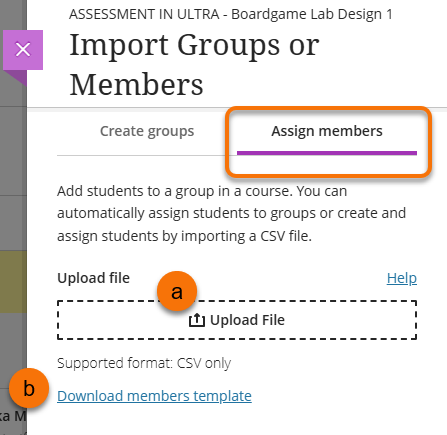 - If you have a group membership csv file ready use the Upload file button (a) to upload the membership file