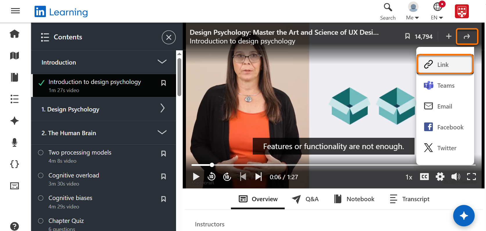 Please note, each section of the course has its own URL, so you can link to the specific section you want students to watch, rather than just linking to the course as a whole.