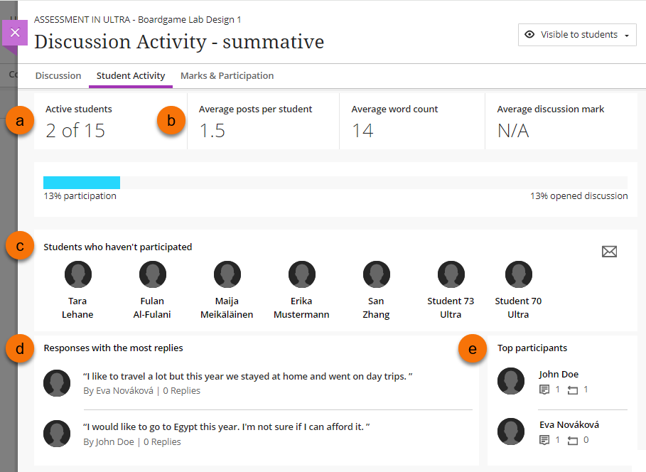 For further information regarding the Discussion Analysis please see the Blackboard Help guide View Discussion Performance and Analytics .