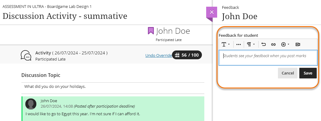 The feedback panel will open, and offer all the options available the the text editor. Save feedback when ready.