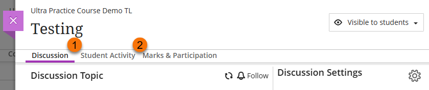 In the Discussion page you may use the tabs Student Activity (1) and Marks & Participation (2) to oversee and mark discussions.