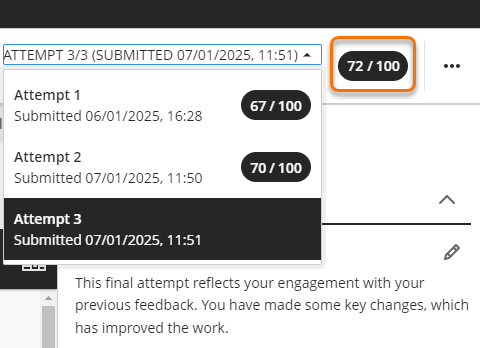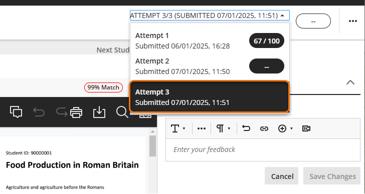 If marking multiple attempts, you can navigate between them using the Attempts dropdown tab and refer to previous marks and feedback. If you are viewing in a smaller screen the attempts list may appear on the left-hand side.
