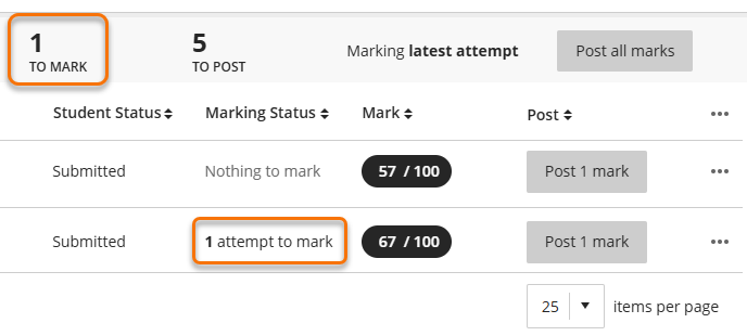 If the Last attempt is selected any new attempts will show as an attempt to mark, even if an earlier attempt has been marked. The latest attempt will display in the marking screen when you open the student’s submission.