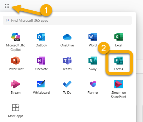 You can access MS Forms via office.com, which is where you access all your other MS 365 apps. Click on the ‘App launcher’ at the top left corner of the MS 365 homepage, and select Forms from the list that appears. If Forms isn’t included on the page, you can search for it or click on ‘More apps’: